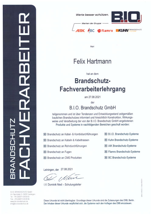 Tendenzen und Entwicklungsstand zeitgemäßen baulichen Brandschutzes. Konstruktion, Wikrungsweise und Verarbeitung von der B.I.O. Brandschutz Produkten und Systemen in nachfolgenden Bereichen geschult: